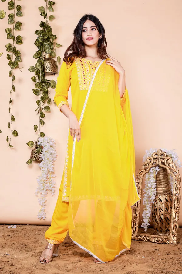 Pure Rayon Embroidered Kurta Pant set with Chiffon Dupatta